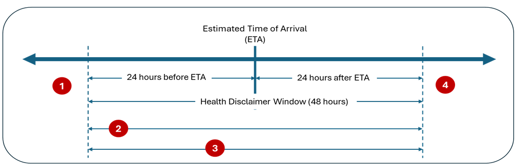 This new enhancement will now require all shipping/vessel agents to submit the "Crew/Passenger Health Disclaimer (Health Disclaimer)" to PHD within 24 hours before or after the vessel's Estimated Time of Arrival (ETA). The diagram below illustrates the Health Disclaimer Window, for which the Health Disclaimer will be activated and visible to the shipping agents to prepare and submit to PHO.