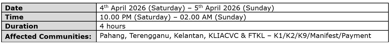 Please be informed that the Royal Malaysian Customs Department (Information Technology Division) will be carrying out scheduled preventive maintenance activities as detailed below:
