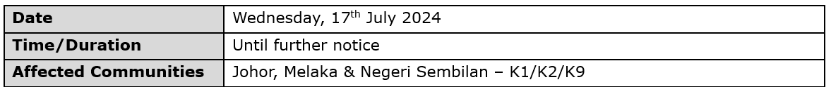With reference to the announcement below, we are currently experiencing technical issues affecting Johor, Melaka, and Negeri Sembilan communities (K1/K2/K9). As a result, all affected users are advised to revert to the manual Standard Operating Procedure (SOP) until further notice.